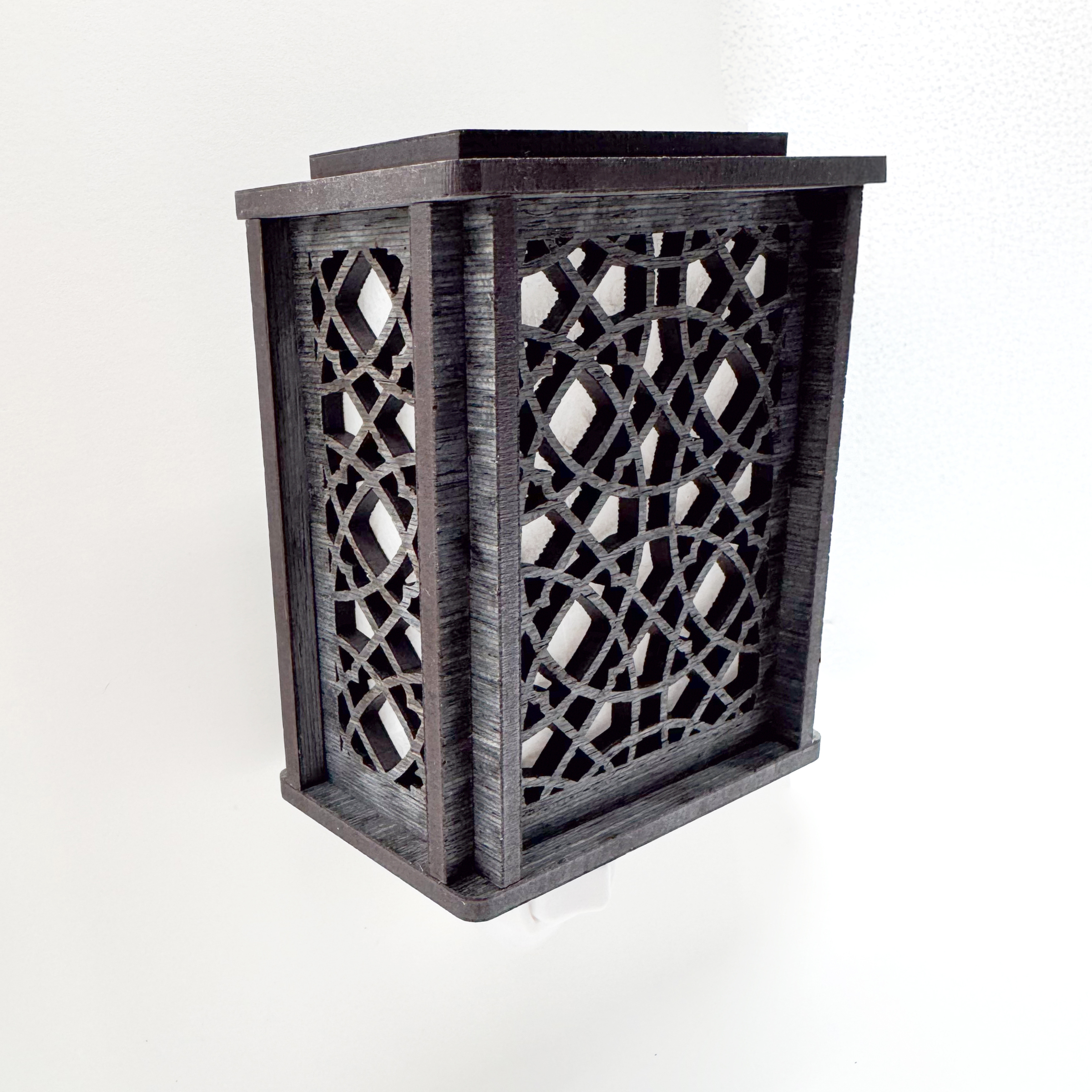 This plug-in LED lantern blends modern design with handcrafted detail. The geometric cutout pattern is laser-cut into layered wood, backed with mulberry paper that filters the light into a gentle, ambient glow.