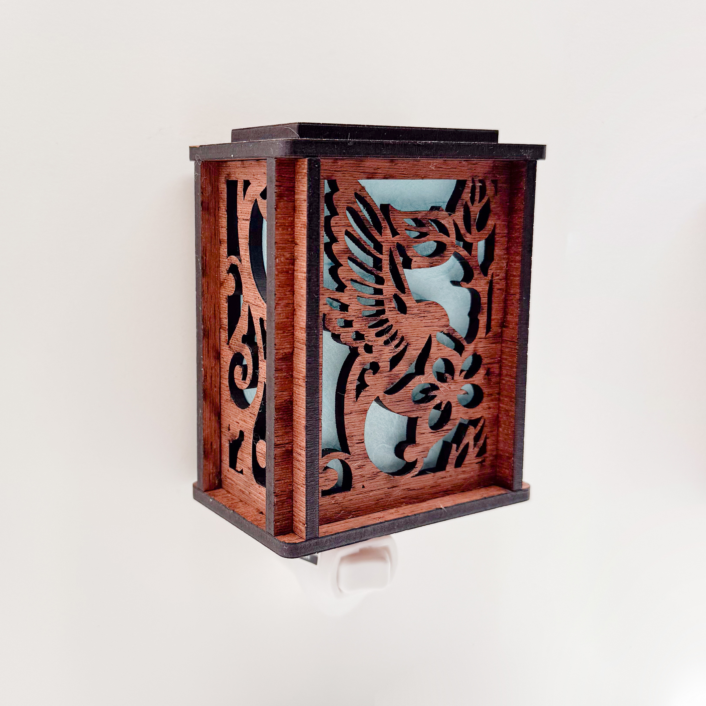 Bring a warm, artful touch to any room with this wooden plug-in LED lantern night light. The detailed hummingbird design is laser-cut from layered wood and backed with mulberry paper — a natural fiber paper that gives the light a gentle, diffused glow.
